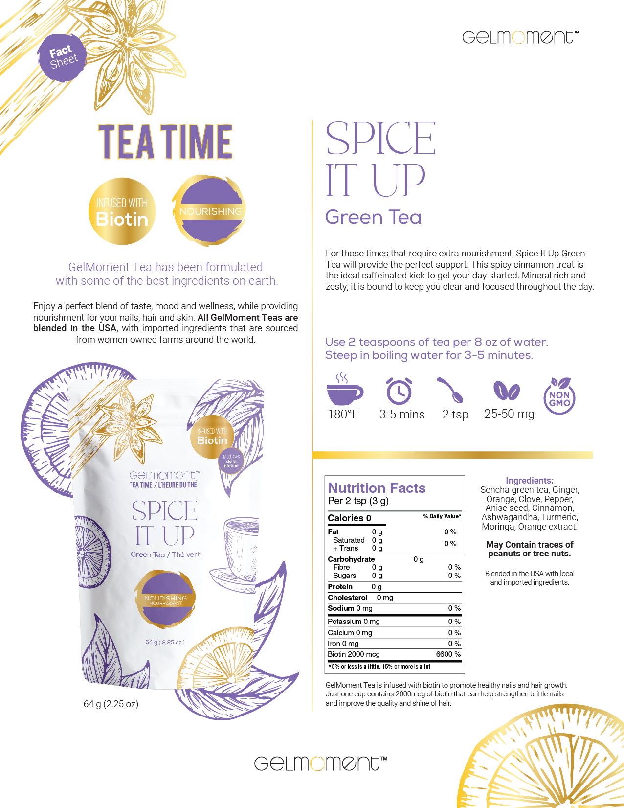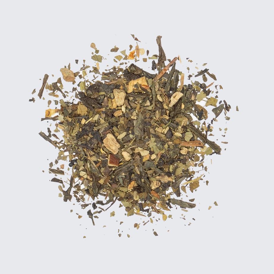 Sencha green tea, ginger, orange, clove, pepper, anise seed, cinnamon, ashwagandha, turmeric, moringa, orange extract.